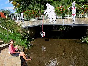 Die restliche Gruppe versuchte erfolglos durch Hinterherlaufen (Mario) oder per Handy mit den beiden Fehlgeleiteten in Kontakt zu treten. Leider hatten wir in den idyllischen Tälern der Fränkischen Schweiz nur sporadisch Empfang und es hatten auch nicht alle die aktuellen Telefonnummern. An der Behringermühle vereinigt sich die Wiesent mit der Püttlach. Hier begann der steile Aufstieg vorbei an beeindruckenden Kletterfelsen nach Gößweinstein. Nach Besichtigung der Wallfahrtsbasilika stärkten wir uns erst einmal in einem Café. Inzwischen hatten wir wenigsten mit Mario wieder Kontakt. Wir verließen den Ort über einen Bogenschießparcour (Wegegebot) und stiegen über die Feldmark hinab ins Püttlachtal. Im Gasthof in Tüchersfeld bestellten wir und Getränke und warteten auf Mario. Vorher versuchten wir noch das obligatorische Foto vom Ort zu machen, das in jedem Reiseführer zu sehen ist. Auf dem folgenden Weg entlang der Püttlach machten sich die bereits zurückgelegten Kilometer bemerkbar. Spät und erschöpft erreichten wir Pottenstein. Erika und Mario hatten noch die Energie, das hoteleigene Schwimmbad aufzusuchen.
